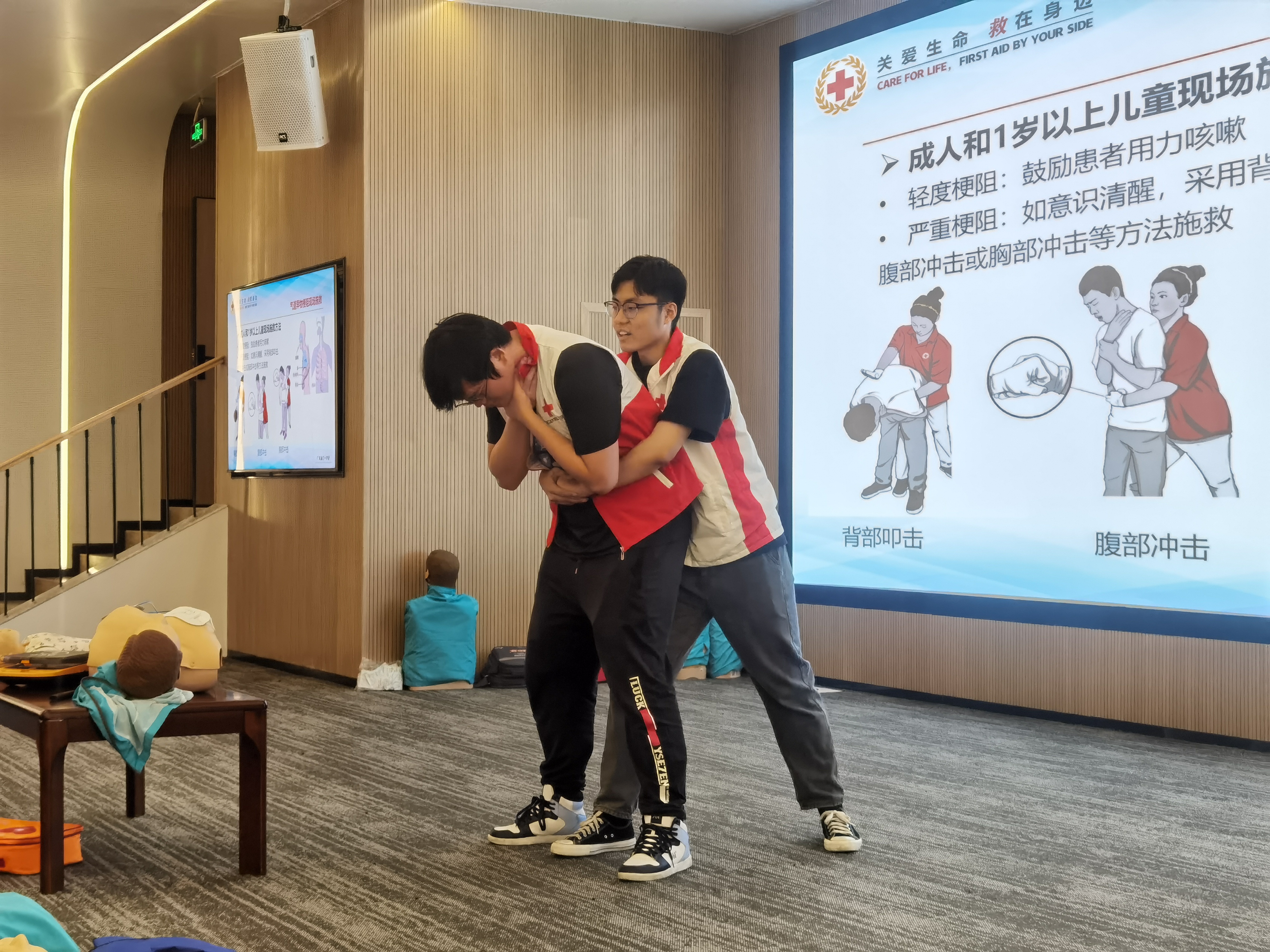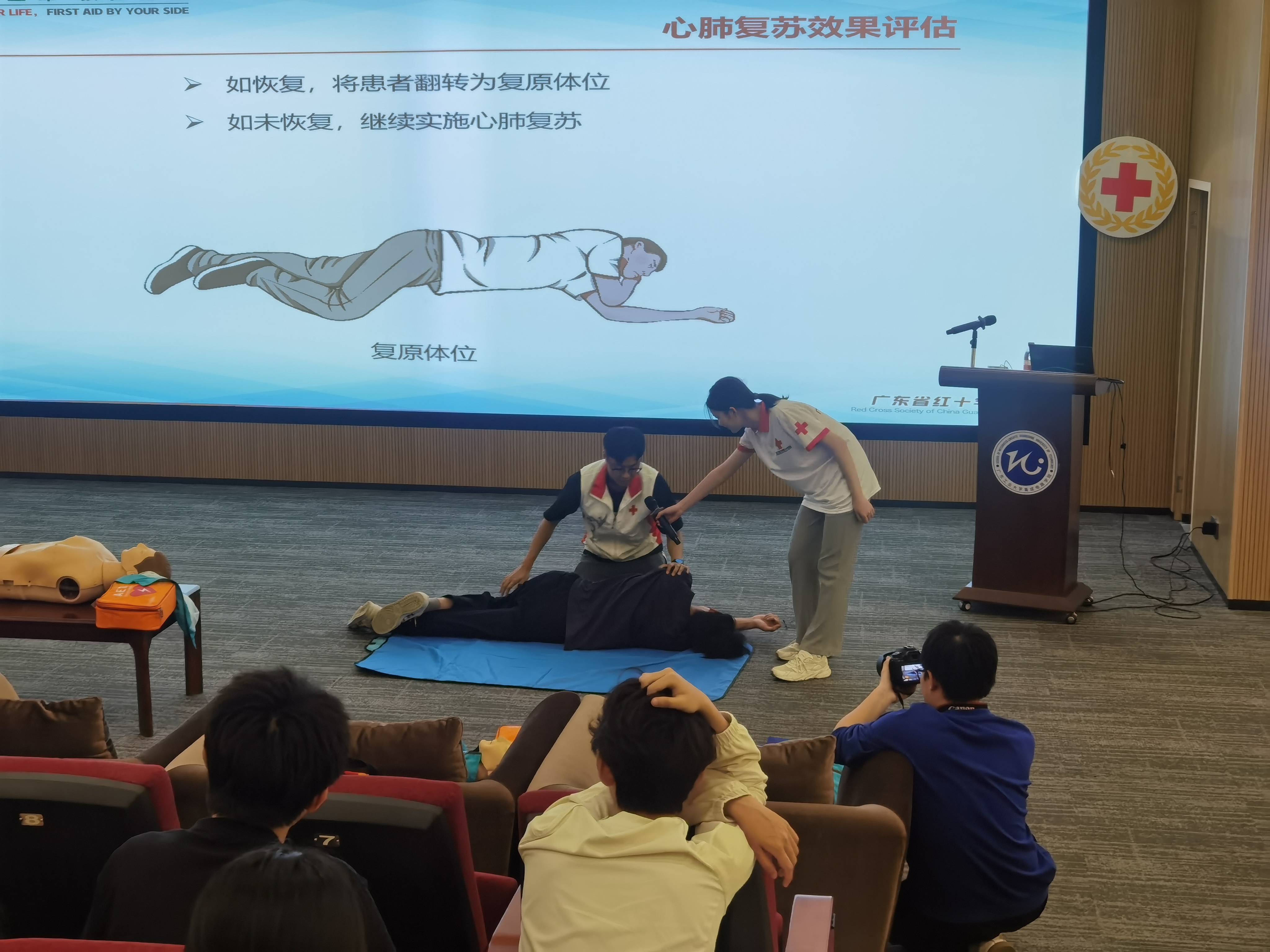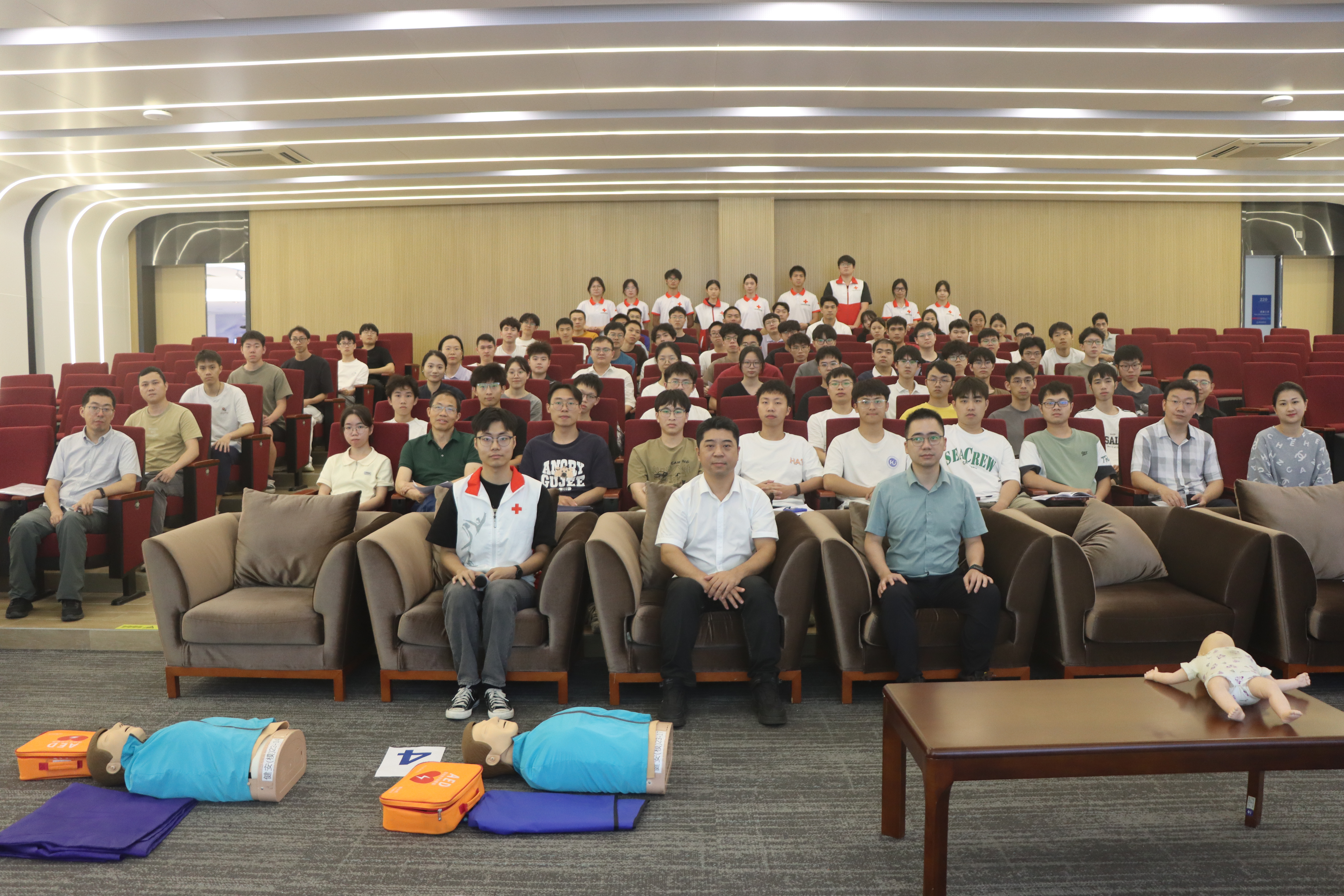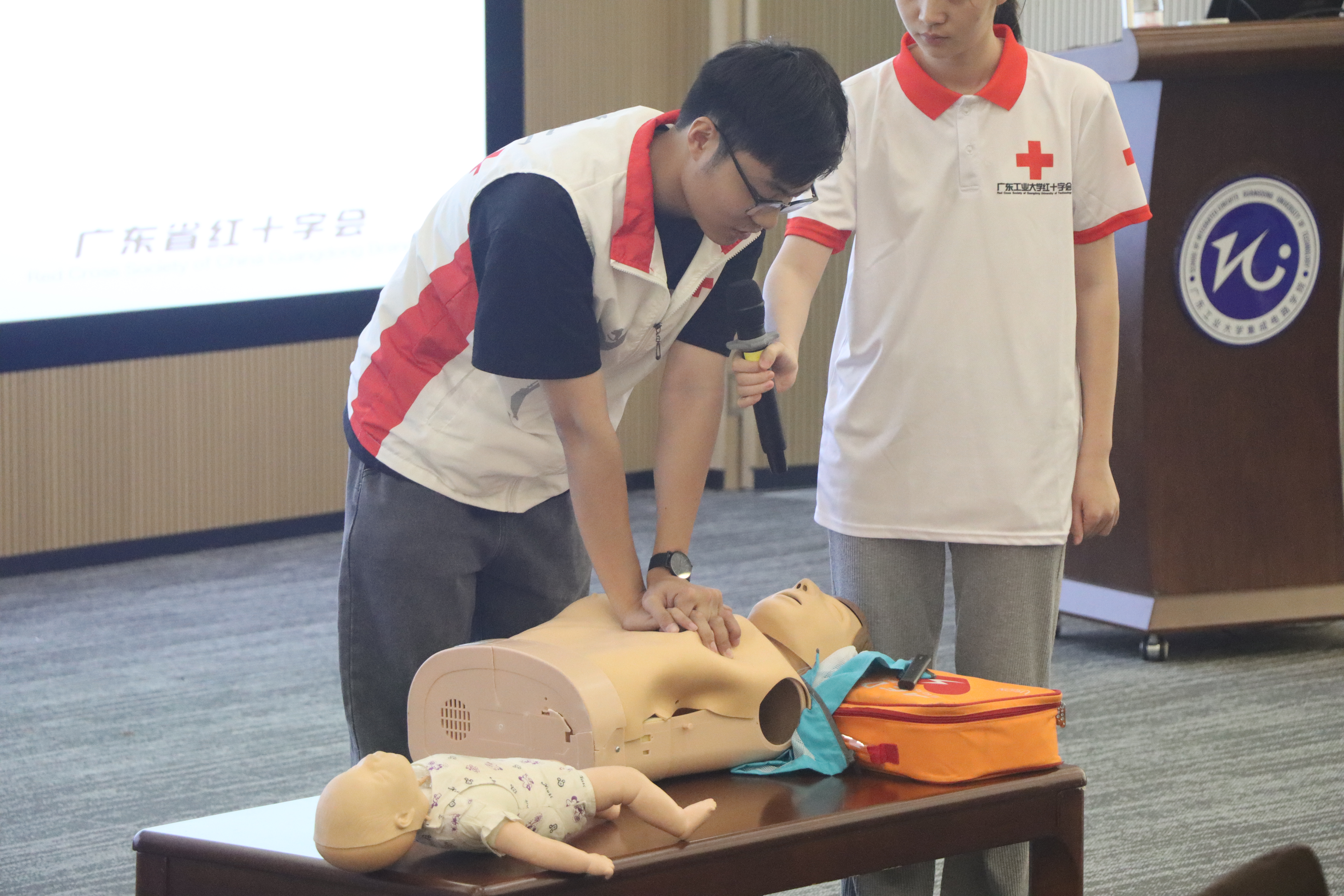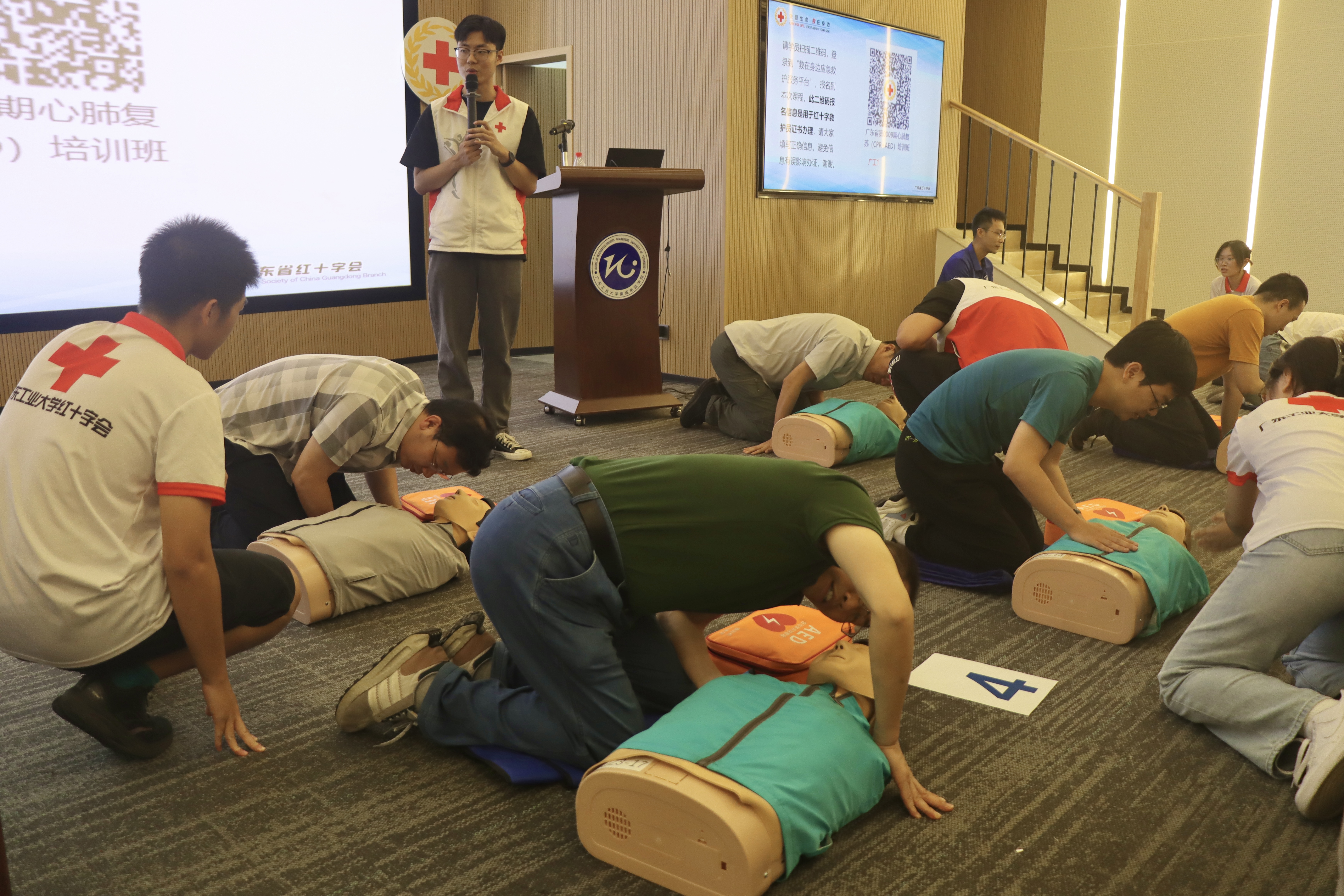 曾德儒老师先后向学生们传授了现场应急救护、心肺复苏术、自动体外除颤器(AED)的急救原理和使用方法、气道梗阻应急救护等内容,并同步安排师生实操。由校红会成员组成的助教团队参与实操培训指导。培训课堂氛围轻松活跃,内容通俗易懂、互动性强,师生们表现出极高的学习热情,认真听讲,主动向老师请教问题,积极参与实践操作。
