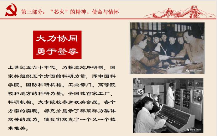 当中国特色社会主义进入新时代,“芯火”精神被赋予了新的时代内涵。刘老师说“热爱祖国是个人安身立命的精神内核,无私奉献是共产主义的价值追求,自立更生是中华民族奋斗的精神基点,艰苦奋斗是永不褪色的精神旗帜,大力协同是社会主义的显著优势,勇于登攀是攻坚克难的精神密码。今天,面对恶劣的国际形式与环境,我们要结合新的时代条件,让“芯火”精神放射出新的时代光芒。”
