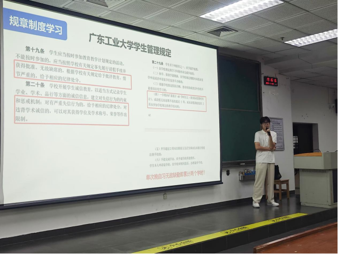 本次主题学习中,谢松强详细解读了《学生手册》中的各项规定,从学籍管理到考试纪律,从出勤纪律评定到违纪处分,无一不进行深入剖析。同时结合具体事例,为同学们重点讲解了《广东工业大学学生违纪处分办法》《广东工业大学学生宿舍管理规定》《广东工业大学学生学籍管理规定》等与同学们日常生活息息相关的制度,让学生们直截了当地了解违反相关规定的后果。