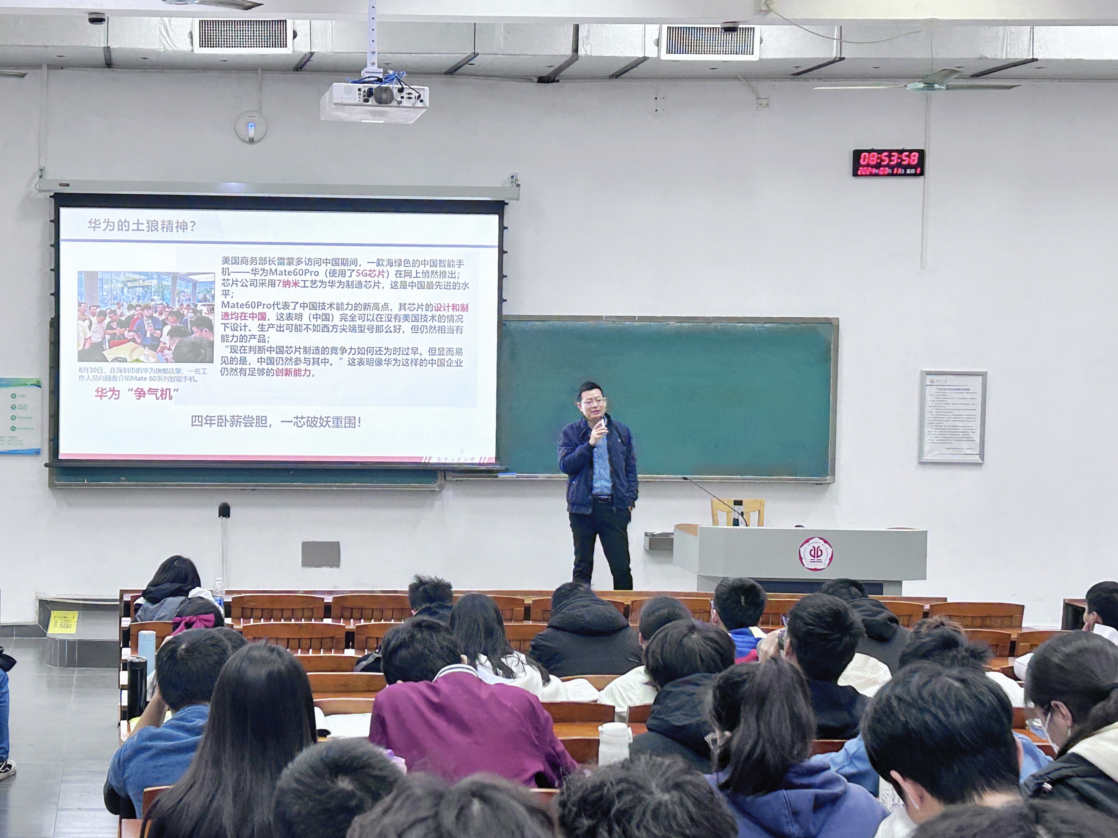 沈彬围绕“保持初心,强芯报国”这一主题,以华为涅槃重生的故事为切入点,分析当前国内外形势,领学党的二十大报告,结合优秀校友和身边同学的故事,鼓励同学们坚定信念,保持初心,增强信心,勤奋学习,以实际行动为中华民族伟大复兴贡献青春力量。