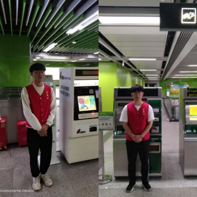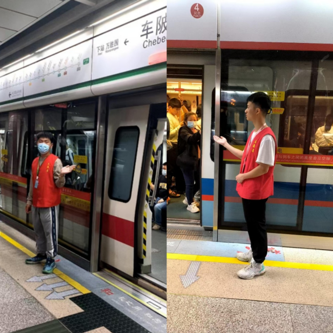 3月16日,由10位同学组成的地铁志愿者队伍在广州地铁大学城北站开展志愿服务。志愿者身穿红色志愿者马甲,在站台维持乘车秩序,引导乘客文明排队乘车;或是在电子售票机前协助乘客购票,热情解答乘客问题。志愿者们热情服务,为来往乘客提供便利,成为地铁站里一道亮丽的风景线。