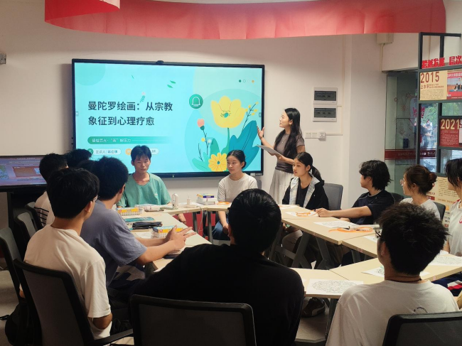 活动伊始,蒋佳琪老师以多媒体课件为载体,向同学们揭示了曼陀罗的三重维度:植物学中的神圣与危险共生特性,佛教坛城沙画的微观宇宙构建法则,以及荣格心理学中自性原型整合的疗愈机制。通过对比西藏僧人创作的沙画坛城与荣格手稿《永恒之窗》,同学们直观感受到跨越时空的“圆之哲思”——无论是宗教仪式还是心理疗愈,曼陀罗始终是秩序与平衡的象征。