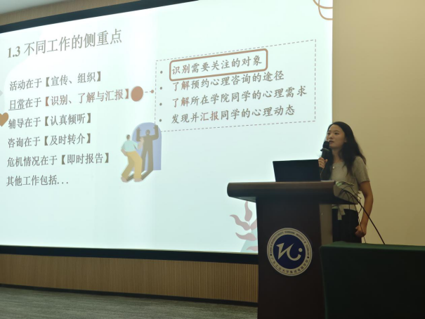 心理指导老师蒋佳琪,2024级本科生辅导员谢松强,2024级本科生及研究生心理委员、宿舍信息员出席了此次培训。