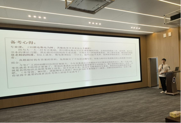 会上,曾柏文同学首先通过介绍自己考研的情况分析了考研的必要性和紧迫性,建议同学们提前准备,了解相关专业、相关学校的课程、考试信息,积极学习相关基础课程和专业课,早作规划,及时和老师沟通。随后,他还分享了自己在备考各个科目,尤其是专业课方面的学习经验,为同学们提供优秀的思路借鉴。