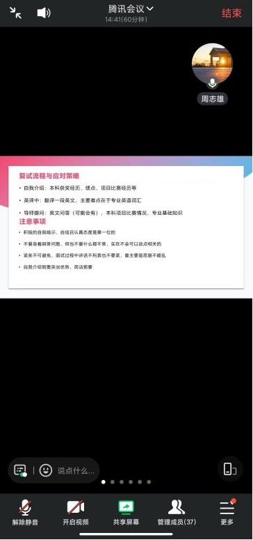 周志雄师兄为同学们理清了复试的基本时间节点和流程。他强调要充分了解复试流程,根据自身情况制定复习计划,进行模拟面试和自我评估。同时,他指出在准备复试过程中要保持积极的心态,学会释放压力。