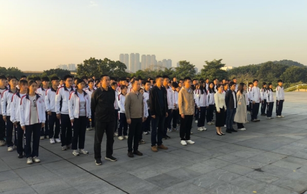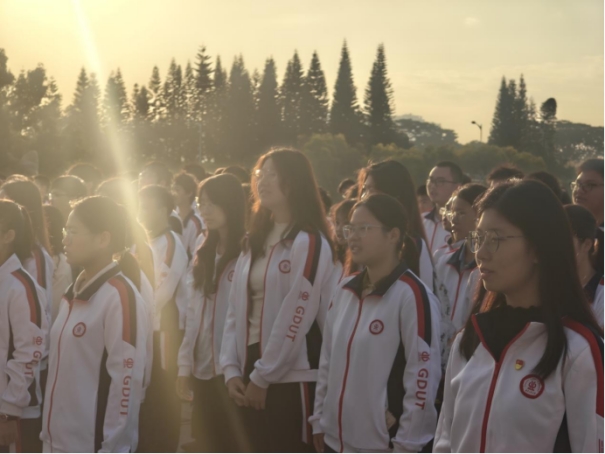 升旗仪式上,国旗护卫队迈着整齐划一、铿锵有力的步伐,护送着五星红旗正步走向旗杆。在庄严激昂的国歌声中,五星红旗迎着朝阳冉冉升起,全体师生齐唱国歌、行注目礼。嘹亮的歌声展现了全体师生深沉持久的爱国情怀和奋发有为的精神面貌。