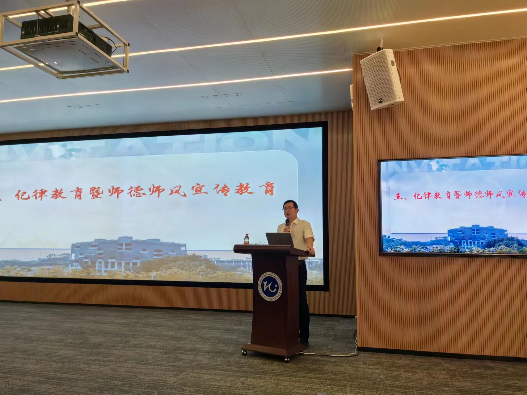 于理学馆报告厅召开全体教职工大会暨师德师风主题教育月动员会。会上回顾了上半年学院工作进展和业绩,对新学期重点工作进行了具体部署。学院领导班子及全体教工出席会议,学院党委书记沈彬主持会议。