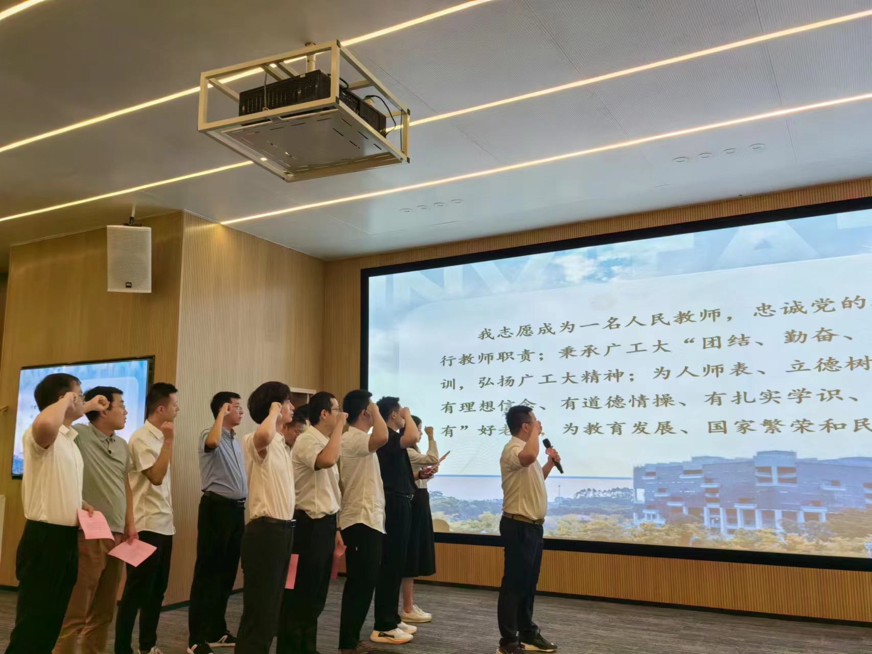 大会开始前,举办了学院新教工入职宣誓暨成长导师聘任仪式,促进青年教师教学能力提升和发展,齐头并进争做有理想信念、有道德情操、有扎实学识、有仁爱之心的‘四有’好老师。接着,成长导师为新入职教师颁发绶带。
