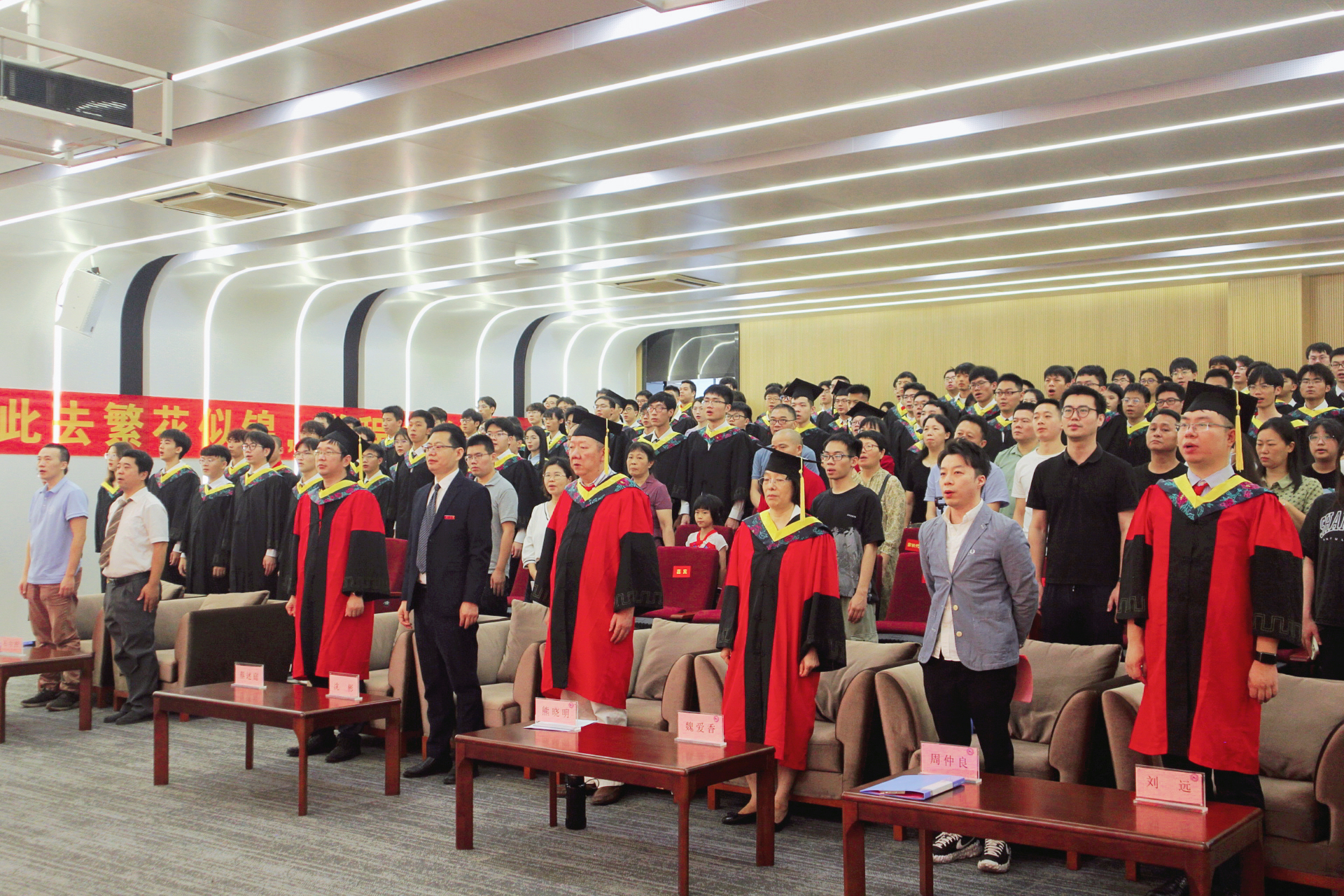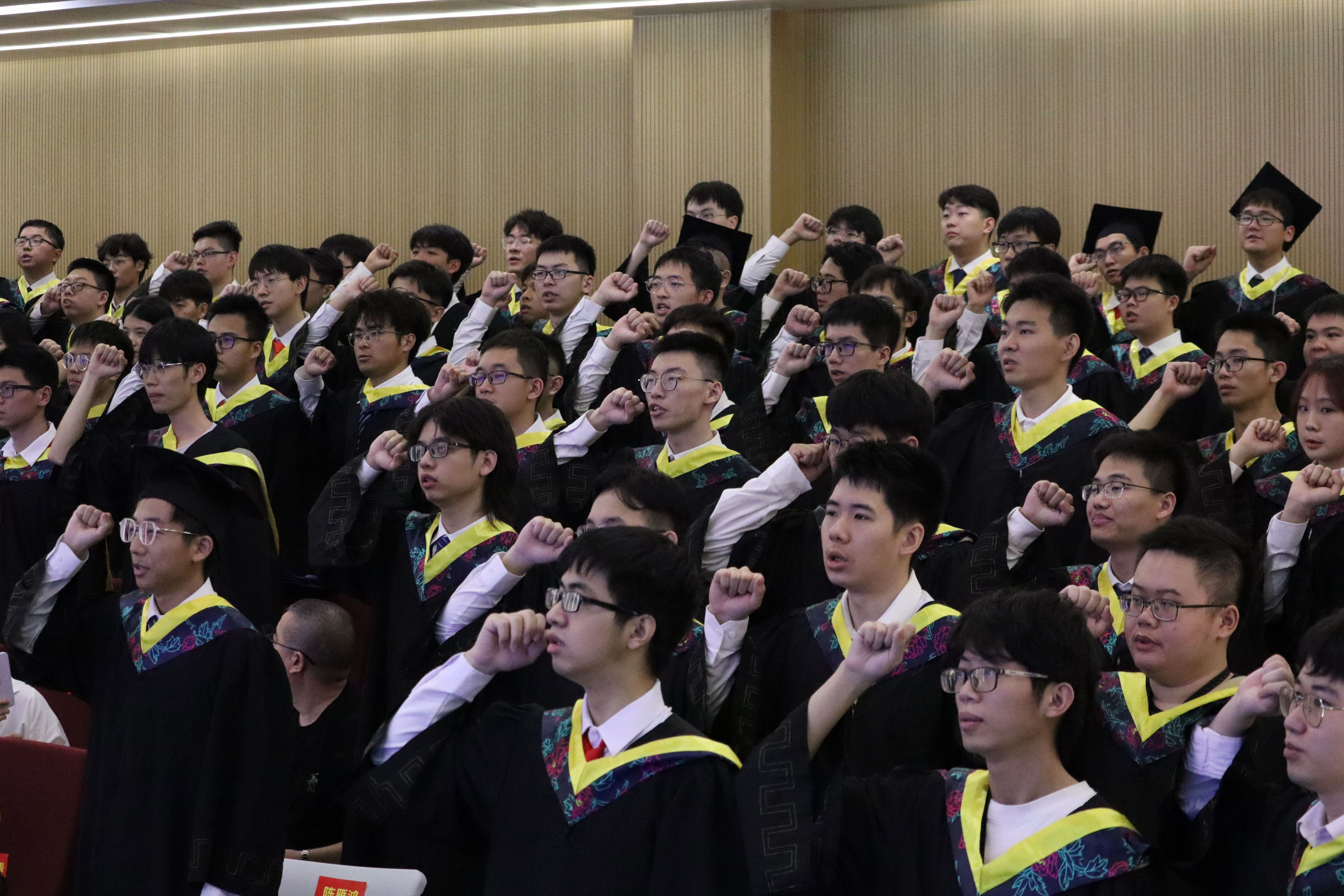 接着,全体毕业生在学生代表陈树强的领誓下,一起庄严宣誓,许下“用聪慧和才智奉献社会,以品格和精神影响他人,用青春和热血强芯报国,让母院以我为荣!”的铮铮誓言。