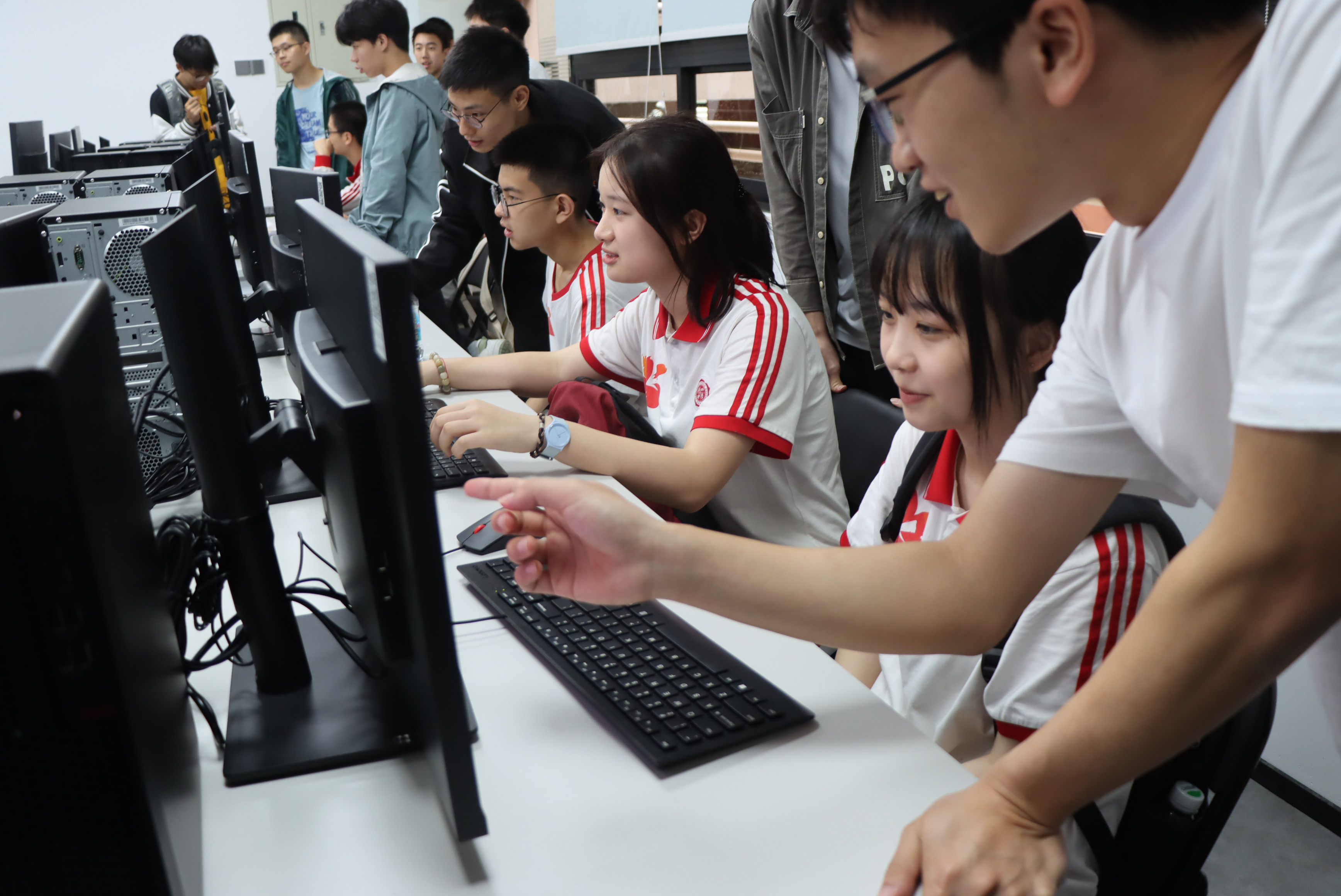 的学生“一对一”结对体验学院特色课程,并在教师的引导下,合作完成实操作业。中学生们积极提问,和师兄师姐展开交流,现场气氛热烈。