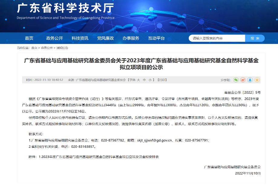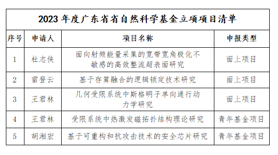 近日,广东省科学技术厅公布了关于2023年度广东省基础与应用基础研究基金自然科学基金拟立项项目公示,角球比分app 共获批立项广东省自然科学基金5项,立项经费50万元,其中面上项目3项,青年基金项目2项。立项名单如下: