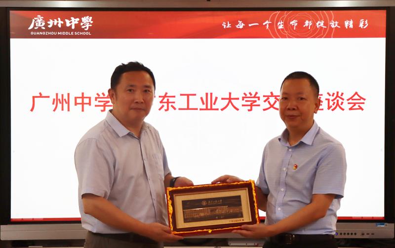 领导班子等一行人,同广州中学校长李强、副校长林少玲和副校长刘允飞等领导老师展开了亲切的交流。李强校长对广工一行人的到访表示热烈的欢迎。李校长从广州中学创立的背景、智慧化校园的建设、“一体两翼三层五维”的特色课程、科技创新等方面介绍了学校的基本情况。