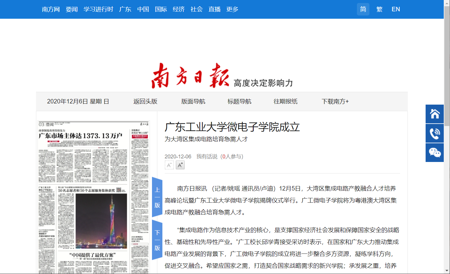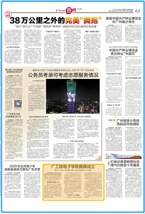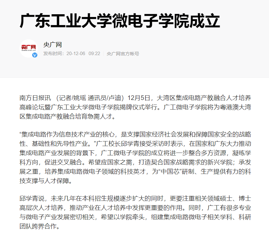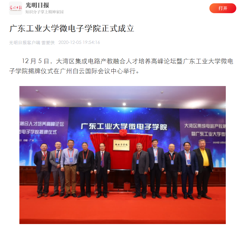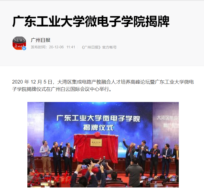 2020年12月5日,大湾区集成电路产教融合人才培养高峰论坛暨广东工业大学微电子学院揭牌仪式在广州白云国际会议中心举行。