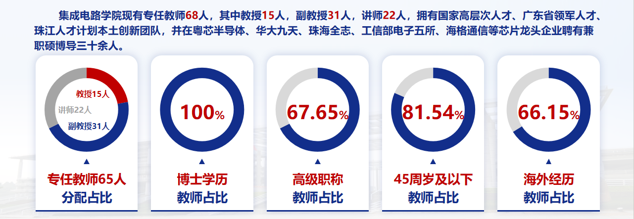 学院现有专任教师68人,其中教授15人、副教授31人、讲师22人,拥有国家高层次人才、广东省领军人才、珠江人才计划本土创新团队,并在粤芯半导体、华大九天、珠海全志、工信部电子五所、海格通信等芯片龙头企业聘有兼职硕博导五十余人。